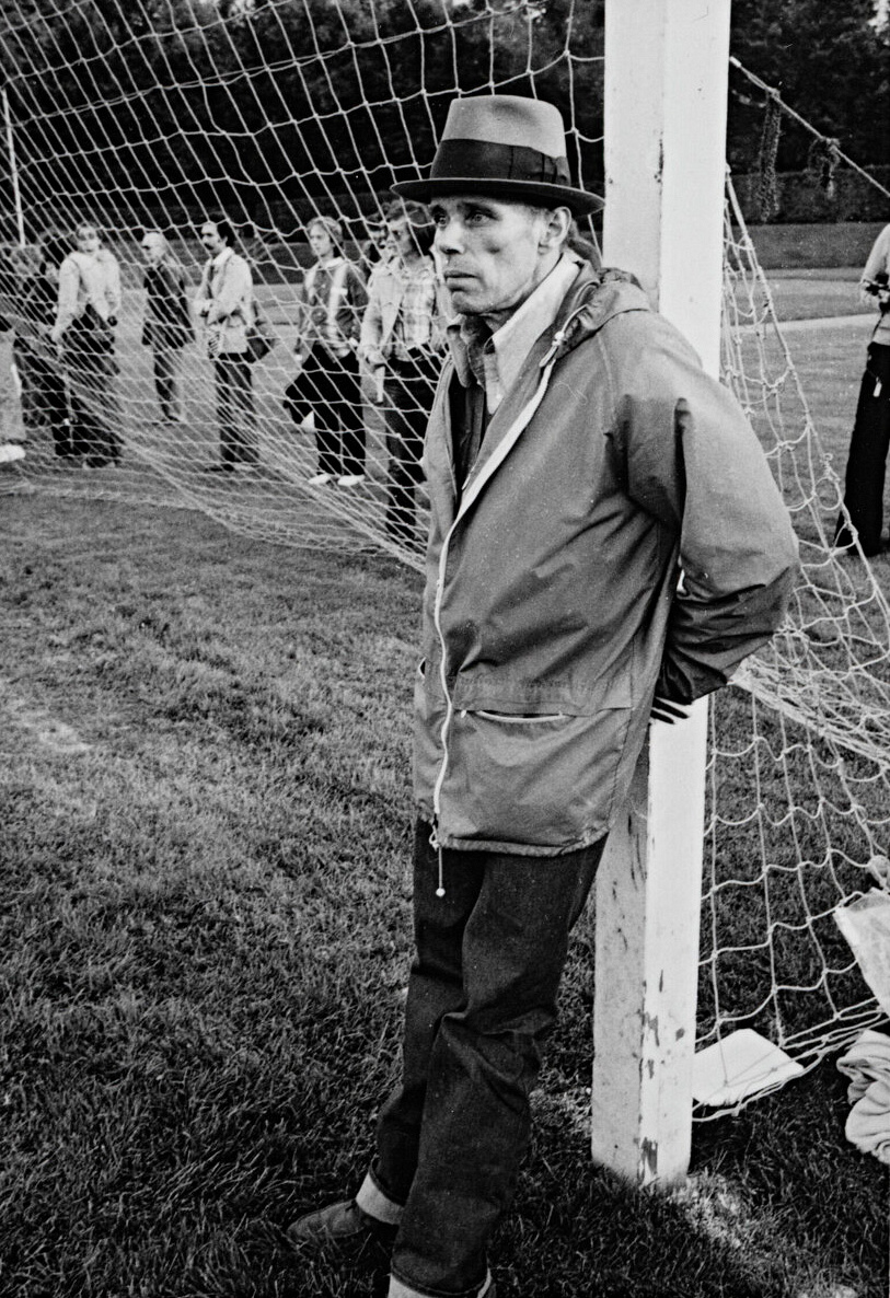 Joseph Beuys keeping the goal of "Dynamo d6". documenta 6 (1977).