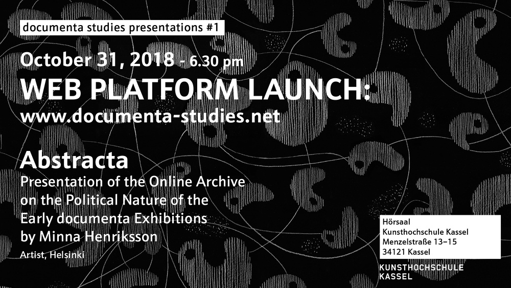 Die erste Arbeit hat die Künstlerin Minna Henriksson, Helsinki, für "documenta studien" entwickelt. Im Rahmen des Weblaunchs stellt sie ihre Arbeit, in der sie die Politik des Kalten Kriegs in Bezug auf die abstrakte Kunst in frühen documenta Ausstellungen thematisiert, in einem Vortrag mit dem Titel "ABSTRACTA – Onlinearchiv zur politischen Natur der frühen documenta Ausstellungen" vor.