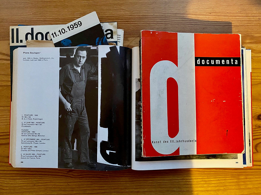 Pierre Soulages in Katalogen und Drucksachen zur documenta I und II. Foto: Julius Lehmann
