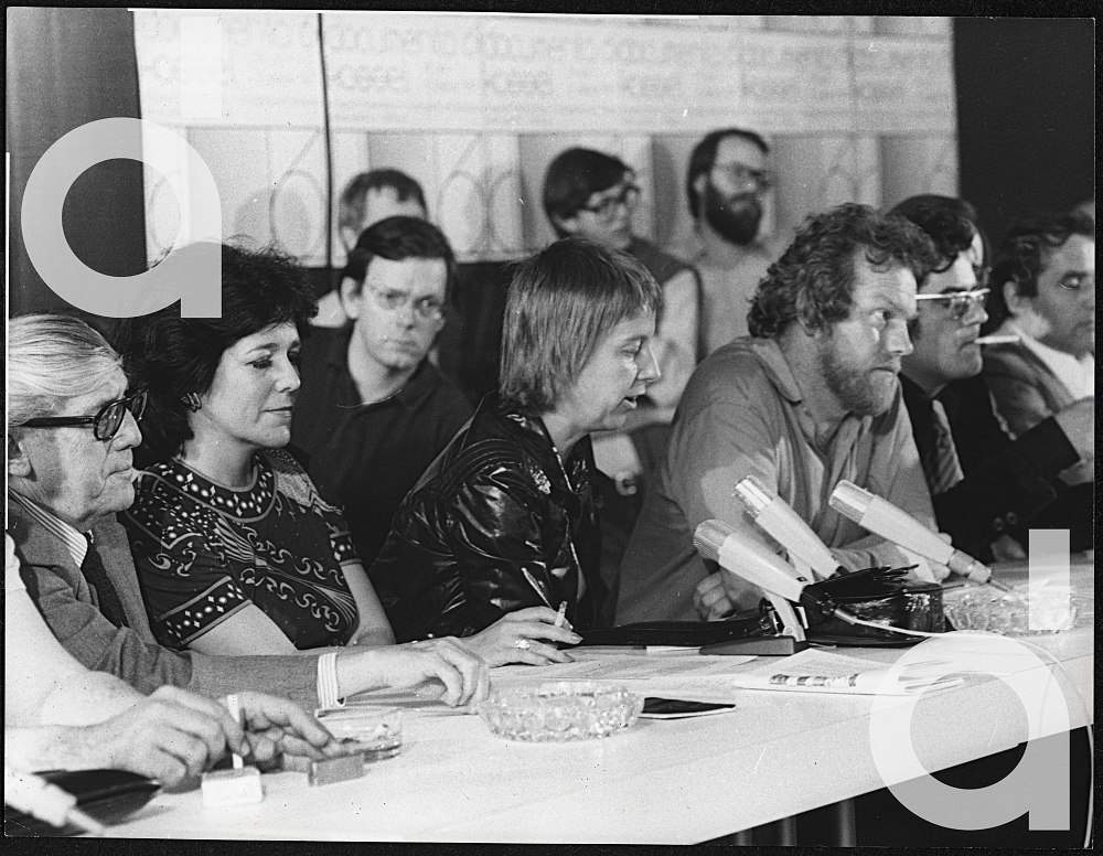 Pressekonferenz zur Eröffnung der documenta 6 im Bürgersaal des Kasseler Rathauses. Auf dem Podium sitzend (v.l.n.r.): Arnold Bode (documenta-Komitee), Evelyn Weiss (Abtlg. Malerei/Fotografie), Birgit Hein (Abtlg. Experimentalfilm), Manfred Schneckenburger (Künstlerische Leitung), Klaus Honnef (Abtlg. Malerei/Fotografie), Gerhard Bott (Abtlg. Utopisches Design).