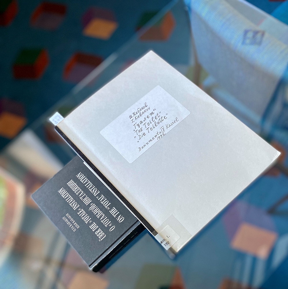 Zufällige Begegnung von Ost und West auf dem Glastisch der Kunstbibliothek: Kabakovs Projektbeschreibung "Die Toilette" und Vorwerk-Teppich von Sol LeWitt im documenta archiv. Foto: Karoline Achilles