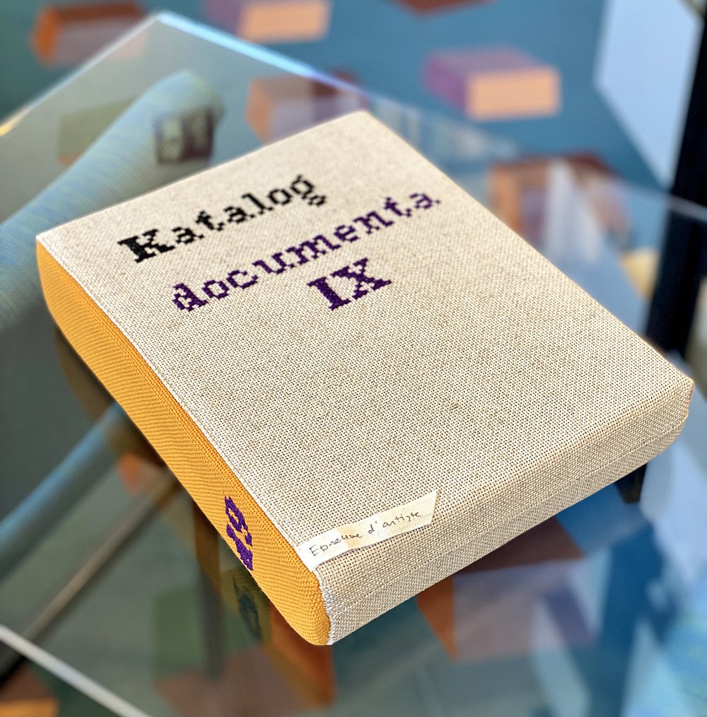 Annemarie Burckhardt, der falsche documenta Katalog für die documenta 9 (Kissenkatalog), Leinen, Schaumstoff, Kreuzstich, 1990