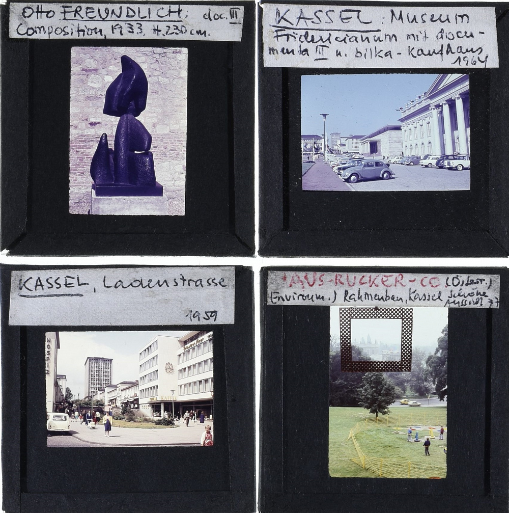 Der ostdeutsche Kunsthistoriker Peter H. Feist (Humboldt Universität zu Berlin) hielt seine documenta Besuche mit der Kamera fest. Die über 90 Dias umfassende Sammlung legt das Augenmerk auf die Gattung Skulptur und einzelne Beispiele Kasseler Architektur. Hier: Otto Freundlich, Composition (1933 / Guss nach 1961); Ansicht Friedrichsplatz mit Fridericianum, jeweils entstanden beim Besuch der documenta 3 (1964); Ansicht der Treppenstraße, documenta 2 (1959), Haus-Rucker-Co, Rahmenbau, documenta 6 (1977).