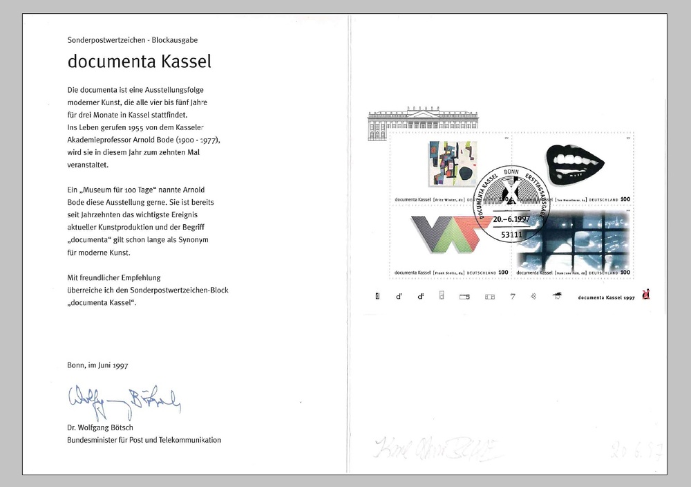Sonderpostwertzeichen zur documenta 10 (1997) mit Motiven von Fritz Winter, Tom Wesselmann, Frank Stella und Nam June Paik, Entwurf: Sybille und Fritz Haase, Erstausgabe 20.6.1997, docA AA d10, 84a