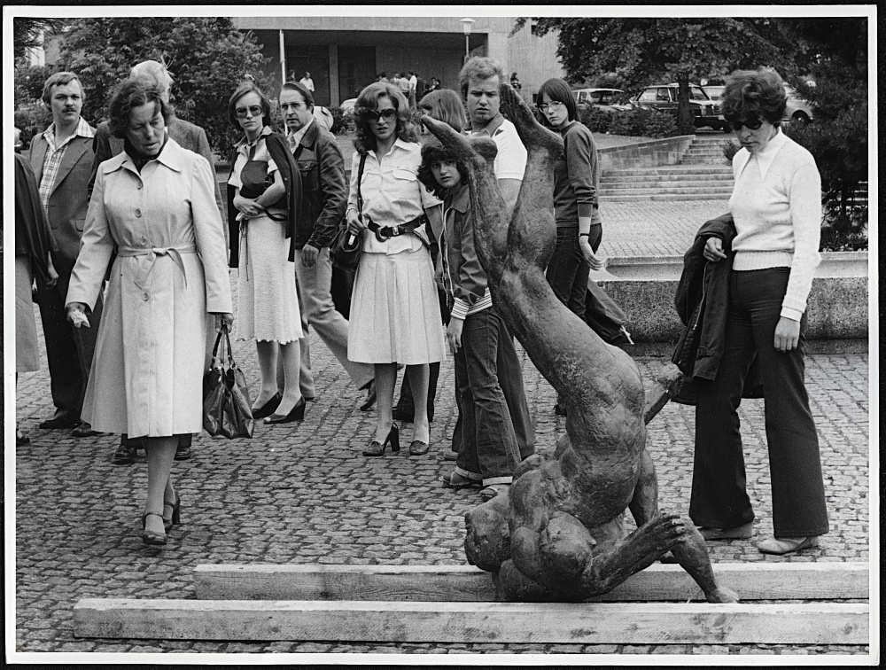 Besucher*innen vor Jo Jastrams "Die Ringer" (1973) während des Aufbaus, Friedrichsplatz, documenta 6, 1977, documenta archiv / Foto: Hans Heinrich Braun (Thomas Michael Braun); © Jo Jastram / Susanne Wunderlich-Rast