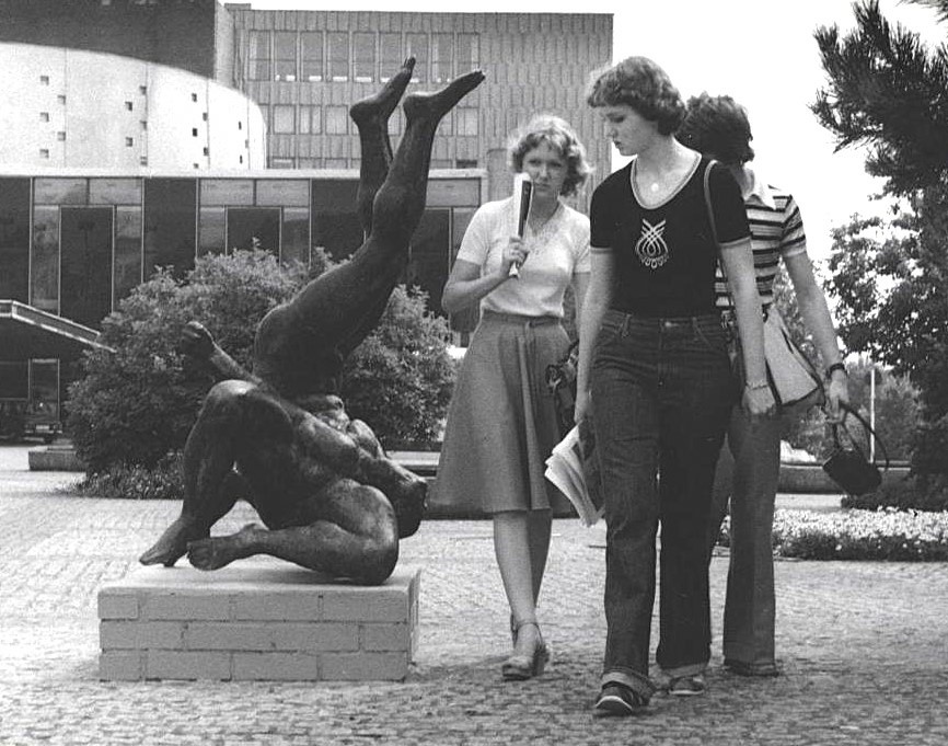 Begegnung von Ost und West auf Kasseler Parkett? Die Bronzeplastik »Die Ringer« (1973) von Jo Jastram vor dem Staatstheater Kassel, documenta 6, 1977, © documenta archiv / Foto: Hans Heinrich Braun (Thomas Michael Braun)