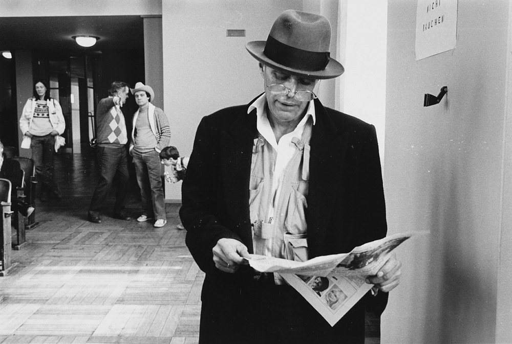 Joseph Beuys auf einem Benefizkonzert für die Aktion „7000 Eichen – Stadtverwaldung statt Stadtverwaltung“ am 14.03.1982 in der Aula der Heinrich-Schütz-Schule in Kassel zur documenta 7 (1982), im Hintergrund rechts Giancarlo Monaco, Intendant Staatstheater Kassel