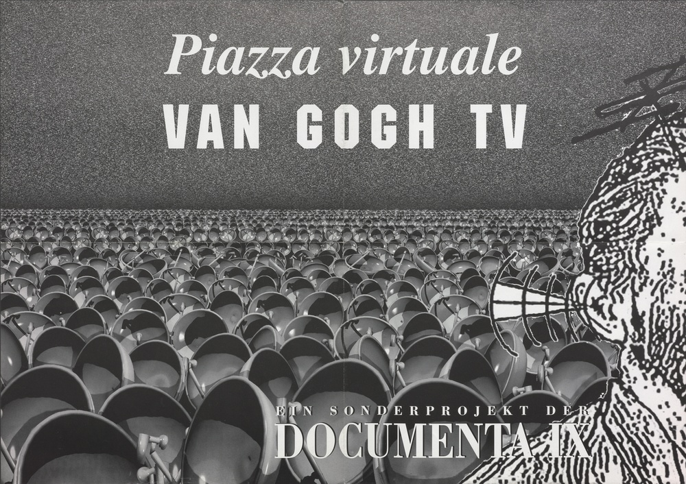 Im Rahmenprogramm der documenta 9, 1992, präsentierte das Medienkunstkollektiv Van Gogh TV sein Projekt „Piazza Virtuale“. Die Gruppe war Mitte der 1980er Jahre entstanden und setzte sich aus amerikanischen, deutschen und österreichischen Medien- und Performancekünstler*innen und Techniker*innen zusammen. Ihr Ziel war die Entwicklung einer kollaborativen Medienpraxis, die den Medienkonsument*innen ein aktives Mitwirken bei der Programmgestaltung ermöglichen sollte. Dazu baute Van Gogh TV ein Netzwerk mit Fernsehstationen in ganz West- und Osteuropa und in Japan auf und strahlte während der documenta jede Nacht mehrstündige Fernsehsendungen aus, die zuvor u.a. unter Mitarbeit internationaler Künstler*innen und unter Einbeziehung verschiedenster Medientechniken produziert worden waren.