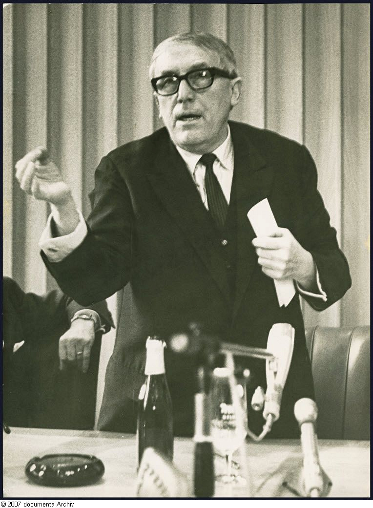 Werner Lengemann: Arnold Bode auf einer ersten Pressekonferenz zur documenta 4 im Kasseler Rathaus, Signatur: docA, MS, d4, 10002819_01.12.1967