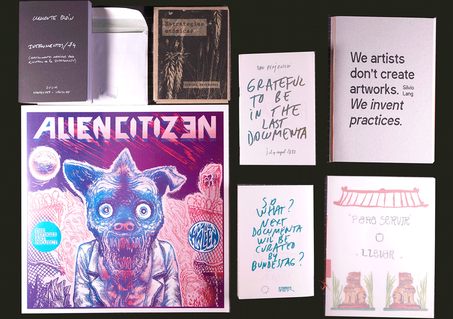As a special enrichment for the documenta archiv's art library, more and more catalogues, artists' books, small publications, magazines and other printed matter of the participating lumbung artists reach us since the final phase of documenta fifteen. These include not only the products of the lumbung Press, which were produced during the exhibition in the temporary print shop in the middle of the documenta Halle, but also publications from earlier years that document the artistic practice of individual actors and groups. Among them are writings by Dan Perjovschi, the Refugee Art Project, Saodat Ismailova, Archives des Lutte des Femmes en Algerie and numerous other artists and collectives.