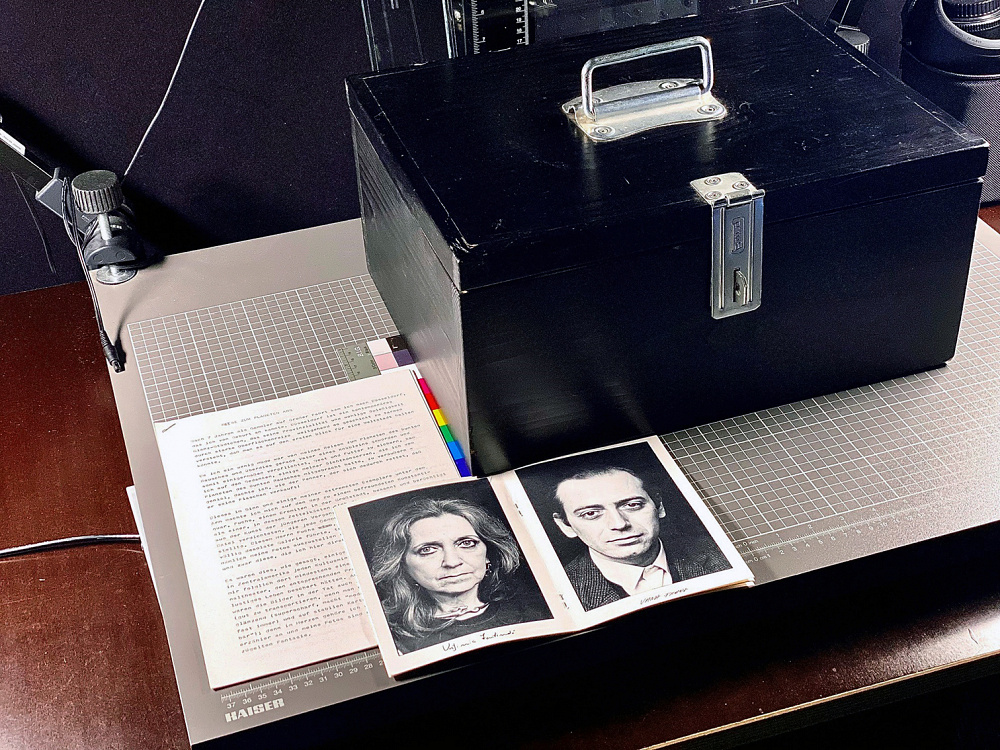 Artist portraits in a travel case: The wooden transport case of the Mebusch edition at the documenta archiv's digitization station.