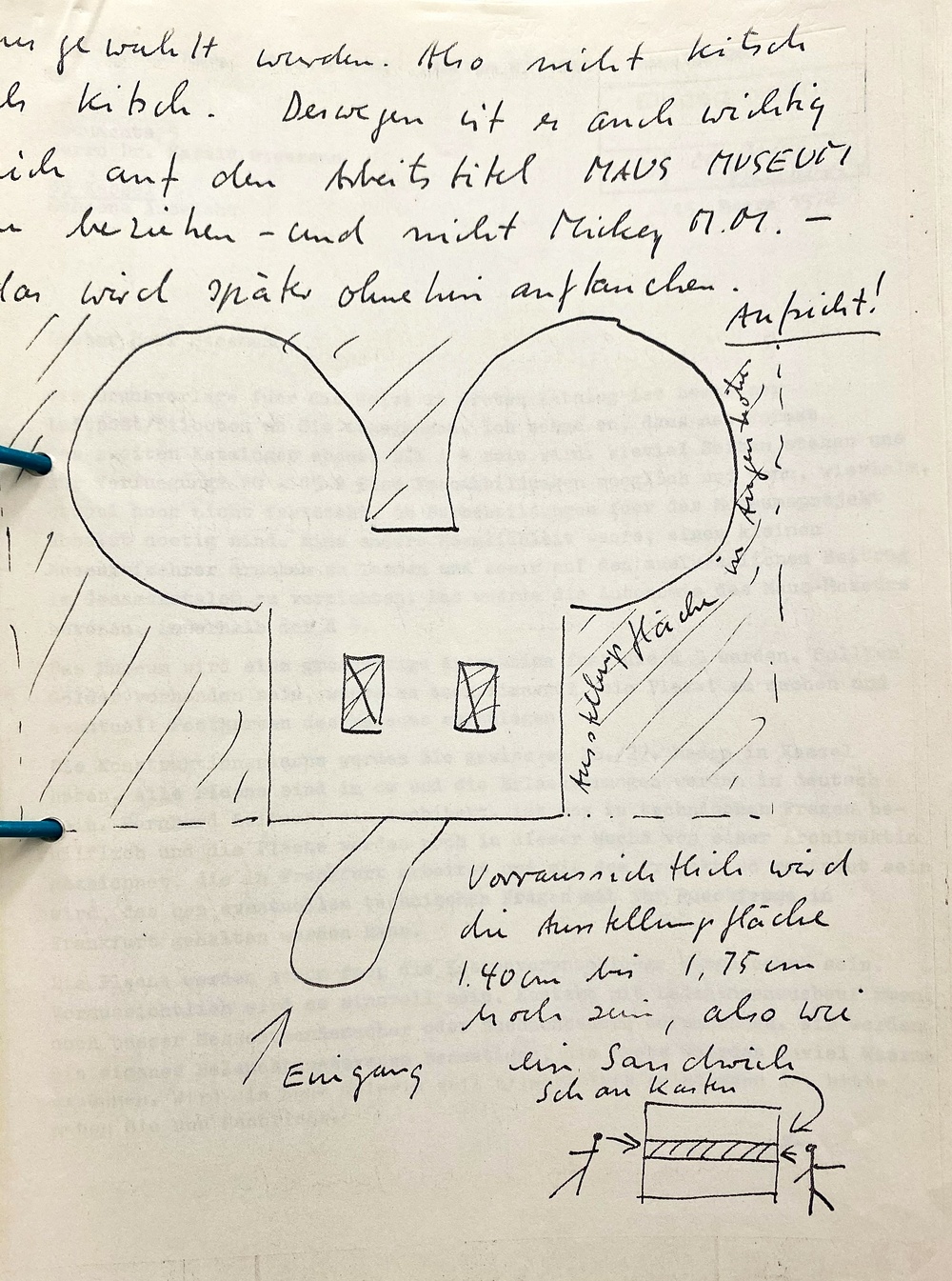 The Mouse Museum as seen from above: a walk-in artists' museum in the shape of a geometric mouse head, realized as Claes Oldenburg's exhibition contribution for documenta 5 (1972). Sketch by Kasper König in a handwritten letter to Harald Szeemann, 1971, docA AA d5, 111.