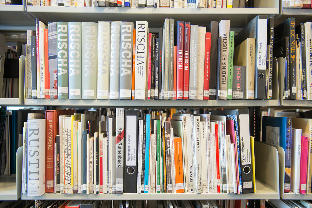 Anita Back: Detail of a book shelf, in view literature to Ed Ruscha (born 1937) who designed the poster and cataloge of documenta 5, Inventory Number: documenta archiv, MS, ABA_6296