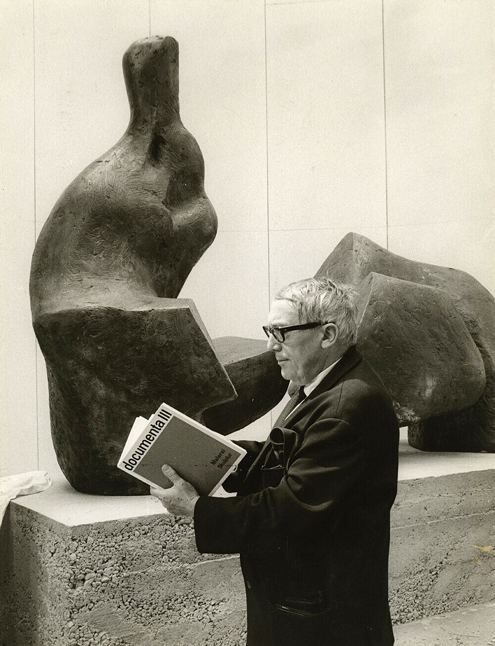 Arnold Bode in front of Henry Moore, „Seagram“, Signature: docA, MA, Eberth, Carl Heinz, F 10038421, © Stadtarchiv Kassel / Foto: Carl Eberth / Henry Moore / VG Bild-Kunst, Bonn